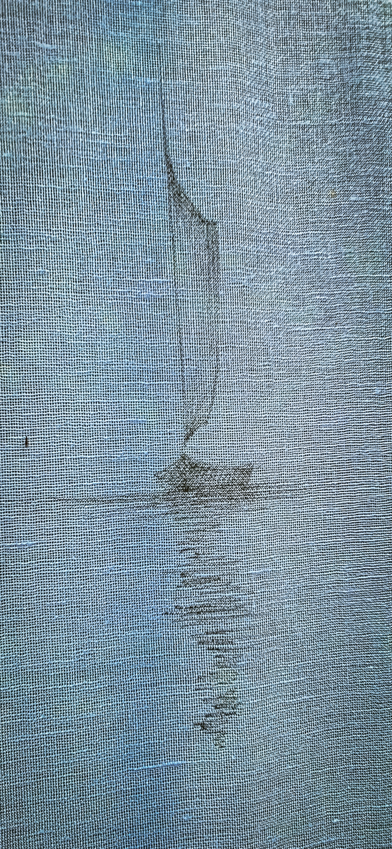 Sopra di esse, tele color celeste — membrane sottili — cercano il loro posto: superfici leggere fra terra e cielo, pronte ad assorbire e restituire luce, vento, parole.