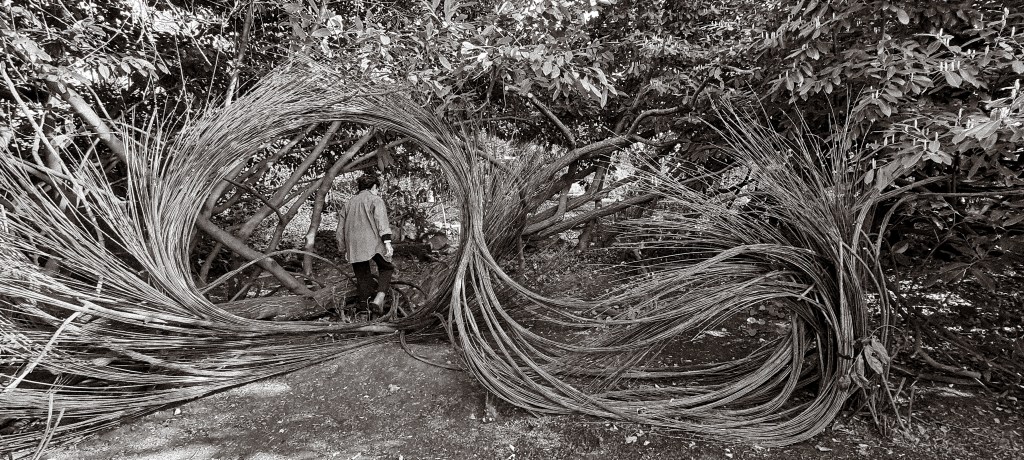 Il segno più netto della nostra presenza è affidato ai sottili rami di salice, raccolti in fasci lunghi e flessuosi, fissati con fil di ferro, grandi come un braccio. È il tocco, il tratto di Patrizia: con questa mina vegetale lascia la sua impronta e compone ciò che sembra una figura in movimento. Distinguo con chiarezza occhi e grembo.